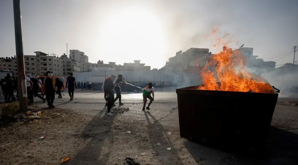People are pictured next to a fire burning in a large container as Palestinians clash with Israeli forces during a protest over tensions in Jerusalem's Al-Aqsa Mosque